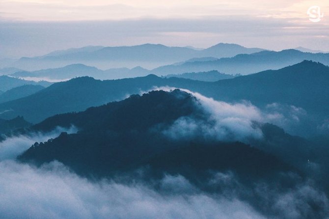 ภูเขานับสิบๆ ลูก สลับซับซ้อนเป็นชั้นๆ ระหว่างกลางของภูเขาแต่ละลูกปกคลุมไปด้วยสายหมอกที่ค่อยๆ ไหลไปตามสันเขา เปรียบเหมือนมีมหาสมุทรอยู่ตรงหน้าและภูขาเป็นเกาะแก่งในมหาสมุทรเลยก็ว่าได้